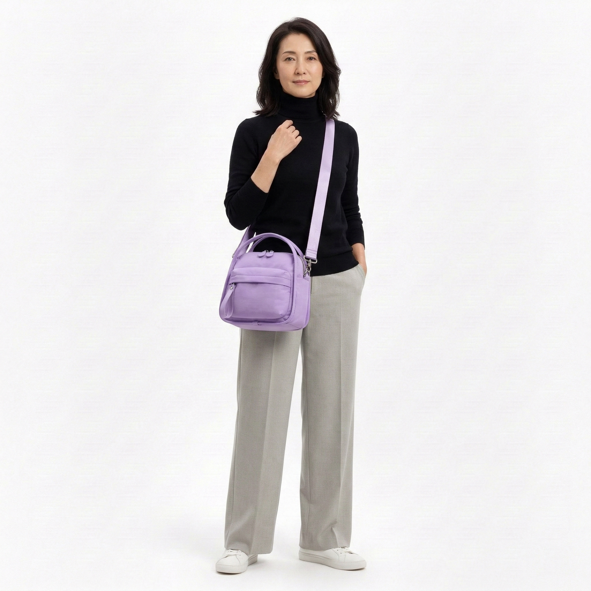 • Carried by hand, shoulder, or crossbody.